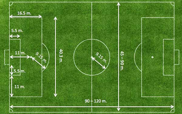 Futbol sahasının ölçülerini standart olarak 105 x 68 metre olarak vermiştir. Bu değerlerden ortaya çıkan alan 7140 m²’dir.
